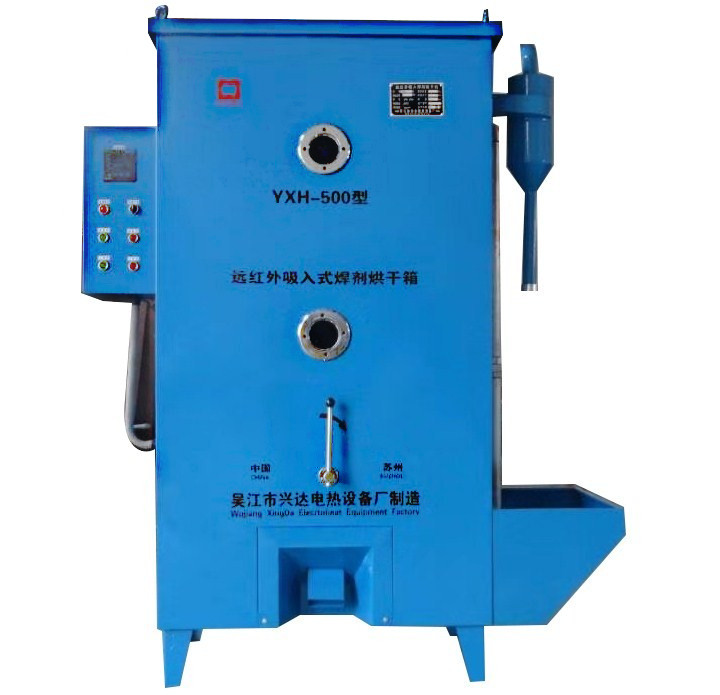 YXH型鼓风型内热式自动焊焊剂烘箱是埋弧自动焊剂专用设备,配有吸料装置,可将焊剂自动吸入箱内,还能去除、收集其中的粉尘,不锈钢远红外电热元件均分布于烘室内,确保了焊剂受热均匀。设有自动控温装置,经烘干的焊剂含水量低于0.1%,工作温度500℃。